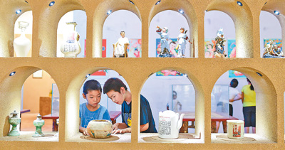 图为9日,大良沟村乡村博物馆内,孩子们在参观农村传统生活用品展。