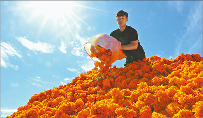 近年来,河北省承德市承德县为推动产业扶贫,采取以“公司+基地+农户”的模式,鼓励当地农户种植万寿菊。万寿菊的花朵是天然叶黄素的主要原料。目前,全县万寿菊种植面积达1.7万亩、参与农户超过5000户,农民通过土地流转和参与打工直接或间接增收致富。立秋以来,当地种植的万寿菊进入盛花期,农民抢抓农时进行第一轮采摘、收储万寿菊工作。