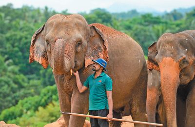 8月12日是世界大象日,该节日旨在呼吁人们关注身处困境的非洲象和亚洲象。图为8月11日,在斯里兰卡平纳维拉大象孤儿院,工作人员站在大象身旁。
