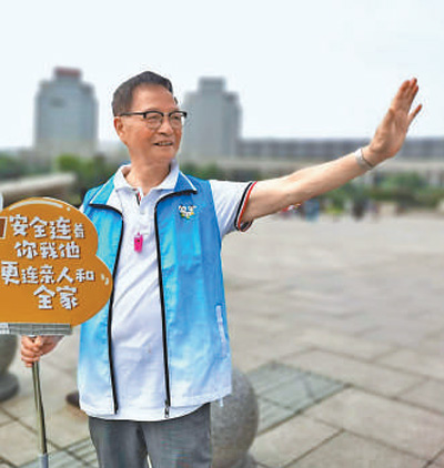 83岁的志愿者陈关键正在路口进行文明劝导。 |