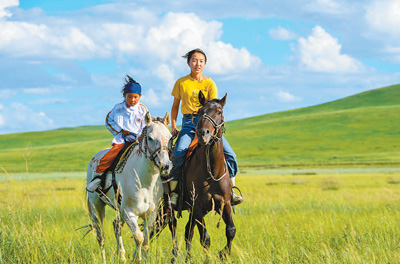 锡林花(右)和小伙伴乌日嘎在草原上骑马。 新华社记者 彭 源摄