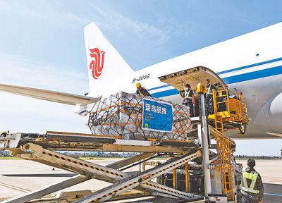 8月13日,中国国际货运航空公司、浙江机场集团联合菜鸟在杭州萧山国际机场开通了浙江省首条去往西班牙马德里的全货运航线,并将保持一周三班的飞行频次。图为执飞货机在萧山国际机场装货。