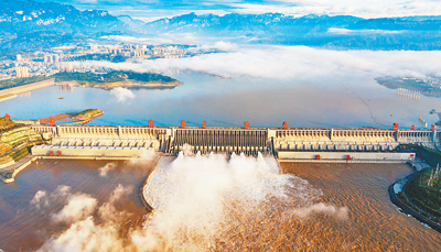 坝上,水库敞怀吞纳,烟波浩渺;坝下,闸孔下泄,巨浪排空。三峡水库拦洪削峰,出库流量控制在4.2万立方米每秒左右,削峰率达33%。