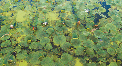 近日,江苏省泰州市姜堰区顾高镇申俞村百亩芡实进入采摘旺季,农民在水塘中忙着采收,一派丰收的繁忙景象。