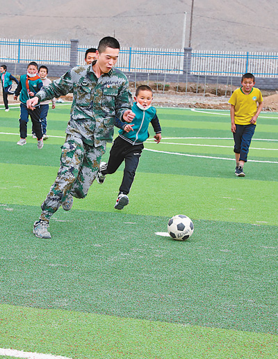 迈丹边防连官兵与迈丹小学的孩子们踢足球。 |