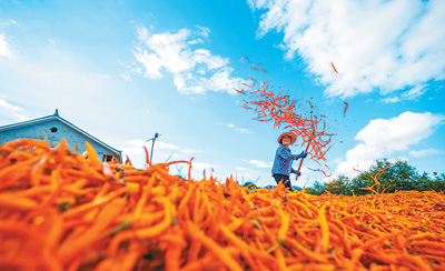 图为8月15日,马家坝村村民在翻晒小黄椒。