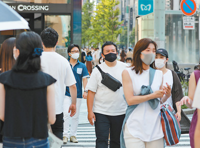 据日本广播协会电视台统计,截至当地时间8月15日21时(北京时间15日20时),日本当日新增新冠肺炎确诊病例1232例,连续3天确诊病例超过1000例,累计确诊55193例。图为当天,在东京,人们戴口罩出行。
