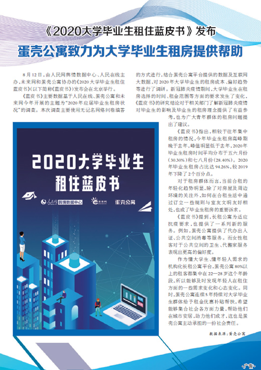 8月12日,由人民网舆情数据中心、人民在线主办,未来网和蛋壳公寓协办的《2020大学毕业生租住蓝皮书》(以下简称《蓝皮书》)发布会在北京举行。