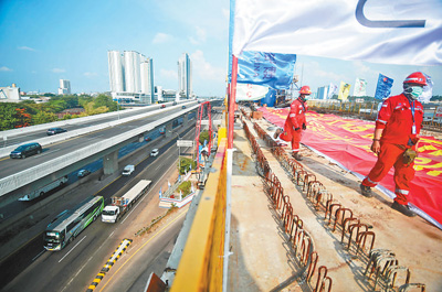 八月十五日,印尼雅万高铁项目一号梁场雅加达至万隆方向架梁通道上的一百米跨刚构连续梁顺利合龙,标志着全线首个架梁通道的形成。图为当地工人在施工现场作业。