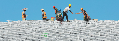 8月12日,建设者们在酷暑下为杭州“亚运三馆”项目屋面加装铝板。 |