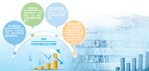 对企业来说,中小微企业可免征2020年2至12月养老、工伤、失业三项社保的单位缴费部分;大型企业减半征收2020年2至6月养老、工伤、失业三项社保单位缴费部分;对湖北各类企业,免征2020年2至6月三项社会保险单位缴费部分。此外,受疫情影响生产经营出现严重困难的企业,可缓缴社会保险费至2020年12月底,缓缴期间免收滞纳金。