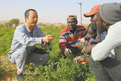 在中国援毛里塔尼亚畜牧业示范中心内,中国专家在向当地牧民介绍苜蓿种植的相关知识。 |
