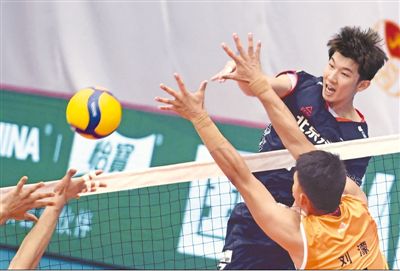 8月26日,北京汽车队球员刘力宾(上)在比赛中扣球。