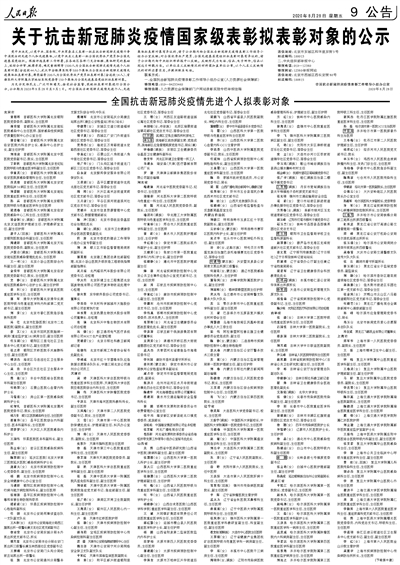 关于抗击新冠肺炎疫情国家级表彰拟表彰对象的公示