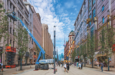 8月30日,上海南京路步行街东拓工程已进入冲刺阶段,工作人员在高空工程车上施工。 |