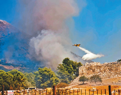 8月30日,希腊伯罗奔尼撒的迈锡尼古城遗址附近发生山林大火。图为当天,飞机在迈锡尼古城遗址附近参加灭火工作。