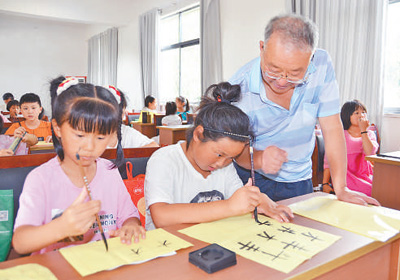 江苏省泗阳县临河镇云渡村的付大中是一名退休教师,2013年,他创办了留守儿童义务辅导班,每年暑假都与孩子们一起练字、唱歌、背古诗,辅导班成了留守儿童的快乐课堂。7年来,参加的孩子由几个人增加到七八十人,课程内容也更加丰富多彩,包括防溺水、防诈骗、防火防电等安全知识讲解。图为付大中在指导孩子练书法。