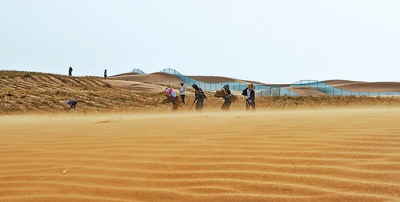 日前,治沙工人在乌玛(内蒙古乌海市至青海玛沁县)高速青铜峡至中卫段扎草方格。乌玛高速青铜峡至中卫段有18公里穿越腾格里沙漠腹地,是宁夏建设的首条沙漠高速公路。