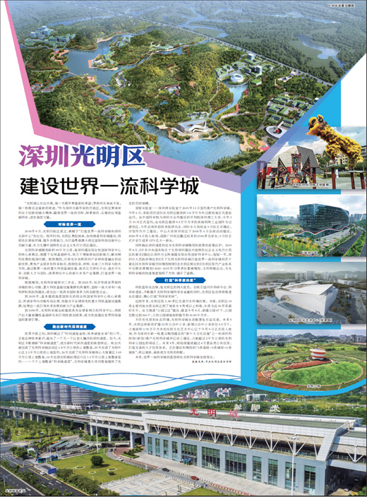 2018年9月,光明行政区成立,被赋予“打造世界一流科学城和深圳北部中心”的定位。两年时间,光明区勇担使命,加快推进科学城建设,持续优化营商环境、提升治理能力,为打造粤港澳大湾区国际科技创新中心贡献力量,有力支撑中国特色社会主义先行示范区建设。