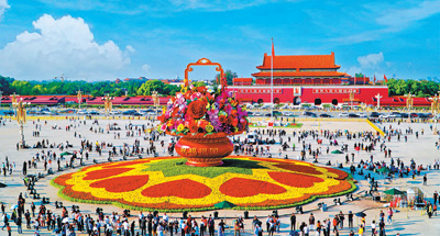 9月24日,天安门广场上2020“祝福祖国”主题花坛基本完工,花坛以大花篮为主景,篮体两侧写有“祝福祖国”及“万众一心”字样,篮内摆放着全国各省份代表花卉及富有吉祥寓意的果实。花坛造型简洁、主题鲜明、热烈喜庆,表达了对祖国繁荣富强、欣欣向荣的美好祝福。图为游客在参观主题花坛。