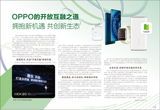 2020 OPPO开发者大会(ODC20)圆满落幕,今年的主题是“智融合 共未来”。每年OPPO开发者大会的主题都是对公司未来发展方向的一次诠释。在新的国内外行业背景下,OPPO面临两个显著机遇:一是5G、AI、大数据和物联网等新技术高速发展下的“万物互融”;二是中国技术和中国创新日益全球化。前者为OPPO的软件、硬件、服务业务的发展提供了前所未有的发展土壤,后者为OPPO的创新产品与服务提供了广阔的市场空间。
