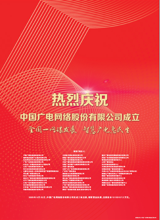2020年9月25日,中国广电网络股份有限公司完成工商注册,领取营业执照,注册资本10120107.2万元。