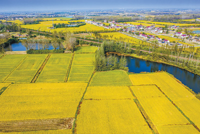 10月12日,安徽省合肥市肥东县石塘镇的2万亩生态水稻进入成熟收割期,秋粮丰收在望,金黄色的稻谷与阡陌田园、蜿蜒村庄相映成趣,构成一幅醉美秋日画卷。