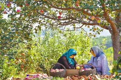 目前,全村建档立卡贫困户全部脱贫摘帽,实现村集体经济收入5万元。图为近日村民在为新采收的苹果装箱。