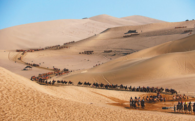 10月18日,游客在甘肃省敦煌市鸣沙山月牙泉景区游览。