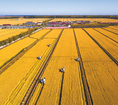 10月18日,辽宁盘锦市盘山县张家村水稻收割正式开始。伴随着机器轰鸣,几台大型收割机在稻田中来回穿梭,田间地头一片繁忙景象。
