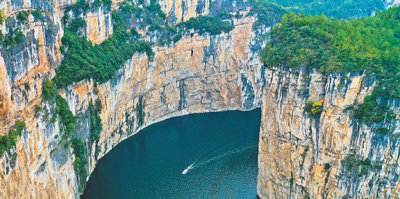 十月二十五日,游客在贵州省瓮安县江界河景区乘船欣赏乌江美景。乌江流经瓮安县的河段俗称江界河,两岸绝壁千仞,绵延数十公里。立足得天独厚的生态优势和资源禀赋,当地大力发展旅游业,推动实现百姓富与生态美的有机统一。