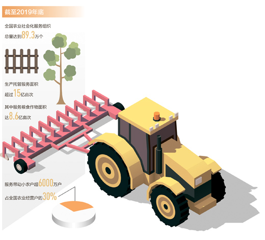 顺应市场趋势,农业生产托管加快发展。截至2019年底,全国农业社会化服务组织总量达到89.3万个,生产托管服务面积超过15亿亩次,其中服务粮食作物面积达8.6亿亩次。服务带动小农户超6000万户,占全国农业经营户的30%。