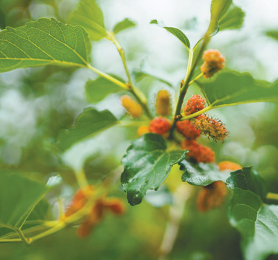 横平竖直的田间,铺展开一望无边的桑林。桑树不高,却枝叶葱茏,每一片叶子都肥美而多汁,绿得精神。底部的枝条已被采摘得光溜溜的,顶部仍在不停地抽出鲜嫩的新芽。这样的长势和桑叶产量,是我幼时所见枝叶稀落的野桑所无法比拟的。这些桑叶的使命是喂养蚕宝宝。而后是茧,是丝,是琳琅满目的丝制品,是村民们走出贫穷、奔向富裕的希望。