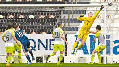 11月27日,北京国安队守门员侯森(上)在比赛中扑救。