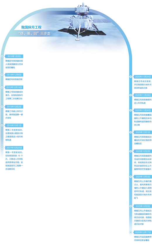 12月12日—16日,轨道器和返回器组合体在完成2次月地转移入射、2次轨道修正后,返回器于12月17日与轨道器分离并重返地球。