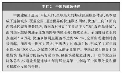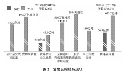 货物运输服务保障能力不断提升。中国是世界上运输最繁忙的国家。面对日益增长的货物运输需求,加快多式联运发展,创新公铁联运、空铁联运、铁水联运、江海联运、水水中转、滚装联运等高效运输组织模式,开展铁路运能提升、水运系统升级、公路货运治理等专项行动,货物运输结构持续优化,综合运输效率不断提高,物流成本逐步降低,交通运输环境污染明显减少,原油、成品油、天然气管道建设不断提速。铁路运量占社会运输总量比例不断提升,“公转铁”行动取得突出成效。港口货物吞吐量和集装箱吞吐量均居世界第一。快递业务量保持强劲增长态势,连续6年位居世界第一。运输服务能力大幅提升,推进物流降本增效取得积极成效,促进了物流业转型升级。(见图2)(见专栏2)