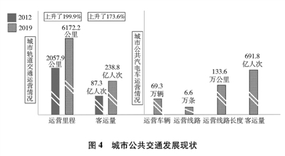 城市公共交通持续优先发展。发展公共交通是现代城市发展的方向,是加强城市交通治理、提升城市居民生活品质的有效措施。大力加强城市轨道交通建设,截至2019年底,全国共有40个城市开通运营城市轨道交通线路,运营里程达6172.2公里,城市轨道交通的骨干作用日益凸显,城市公交出行分担率稳步提高,舒适度不断提升。城市慢行交通系统较快发展,70余个城市发布共享单车管理实施细则,360余个城市提供了共享单车服务。城市公共交通的发展为人们出行提供了便利,满足了多样化出行需求。(见图4)(见专栏3)