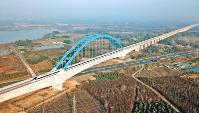 12月22日,京港高速铁路合肥至安庆段开通运营。线路全长176公里,设计时速350公里,共设合肥南、肥西、舒城东、庐江西、桐城东、桐城南、安庆7座车站。图为一列高铁列车经过安徽肥西花岗特大桥。