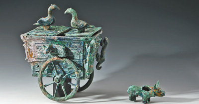 车形盒,整体外形像个车,其实就是在长方体盒的下面两侧装上了车轮,车轮可以灵活地转动。6号墓的一件车形盒盖上,左右各站立着一只小鸟,尖喙,曲颈,双翅微张,鸟尾略翘,双足并立于盒上,两两相对,姿态悠然,盒身前后各装饰一卧牛。和盒体同出的还有一件铜牛,用于拉车,神态憨态可掬,虽做工简单,但神形兼备。