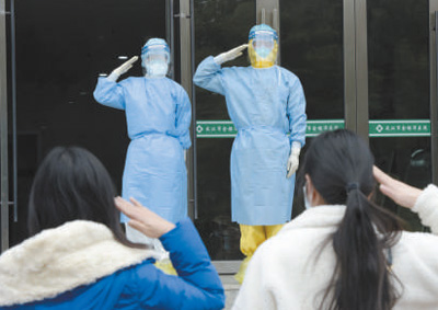 2月1日,军队支援湖北医疗队队员与新冠肺炎治愈患者互相敬礼致意。 范显海摄