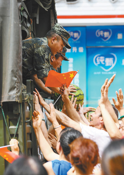 8月21日,武警重庆总队机动支队官兵完成抗洪抢险任务。乘车离开时,当地群众赶来送别。 王 肸摄