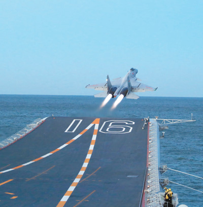 深秋,歼—15舰载战斗机在航母上起飞。 张 帆摄