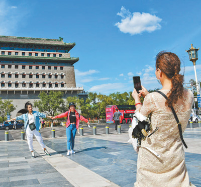 蓝天白云下的北京,景色宜人,游客在前门步行街拍照留念。 |