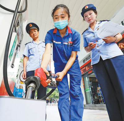 安徽淮北,执法人员在加油站抽检油品。 |