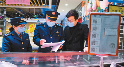 为加强新冠肺炎疫情防控,浙江省嵊州市市场监管局工作人员到超市检查进口冷链食品“浙冷链”平台使用情况,并进行溯源化管理,保障群众生命健康。