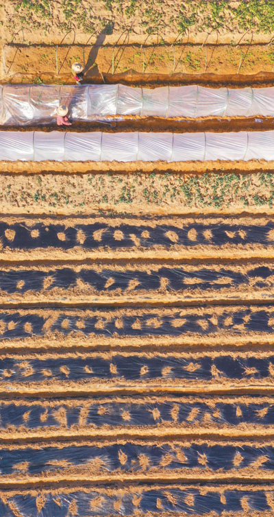 1月2日,江西吉安泰和县塘洲镇洲头村,农民正在田间劳作,给蔬菜覆盖薄膜,确保农作物安全越冬。