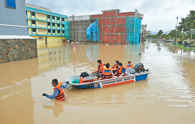 马来西亚政府部门表示,马来西亚多地因连日强降雨引发水灾,截至1月6日下午,已有约3万民众被疏散。图为4日,在柔佛州的哥打丁宜,救援人员转移被洪水围困的居民。