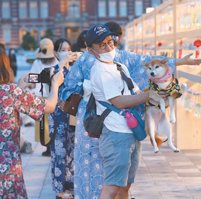 2020年8月,日本东京车站前广场举行了一场夏日风铃展。图为一名日本民众在展览上怀抱宠物犬留影。 |