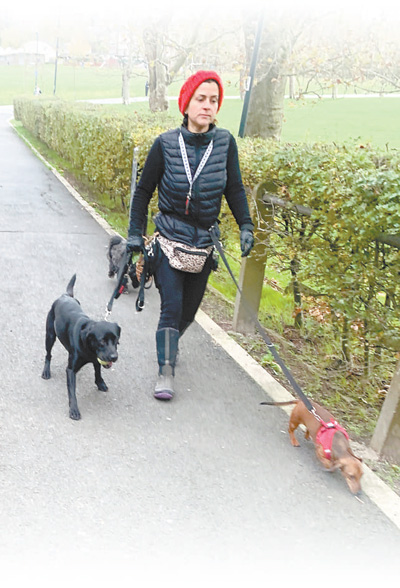 一名宠物饲养者正在英国伦敦的公园中遛狗。 |