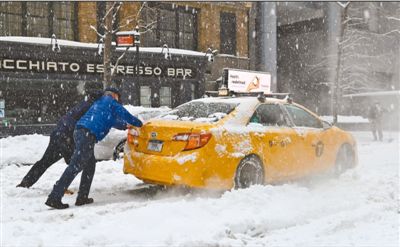 美国纽约州近日遭遇持续暴风雪袭击,州长安德鲁·科莫2月1日签署行政令,宣布纽约市和附近约10个县从当日起进入为期31天的灾难应急状态。图为1日,人们在纽约街头推一辆出租车。